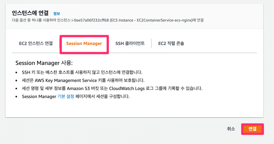 그리고「Session Manager」탭을 클릭하고 연결 버튼을 클릭하면 Private Subnet의 EC2로 접속할 수 있습니다.