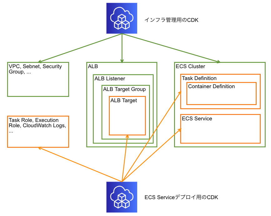 このリソース構成のうち、緑色の線で示したリソースはインフラ管理用のCDKで管理し、オレンジ色の線で示したリソースはECS Serviceデプロイ用のCDKとしてアプリケーションのリポジトリで管理しています。