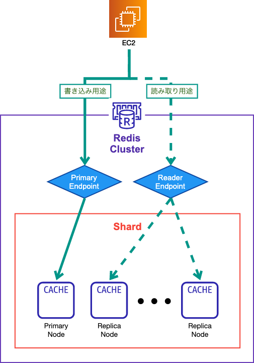 またRedisクラスターにアクセスするためのエンドポイントとして、書き込み用途のプライマリエンドポイントと、読み取り用途のリーダーエンドポイントの2種類が提供されます