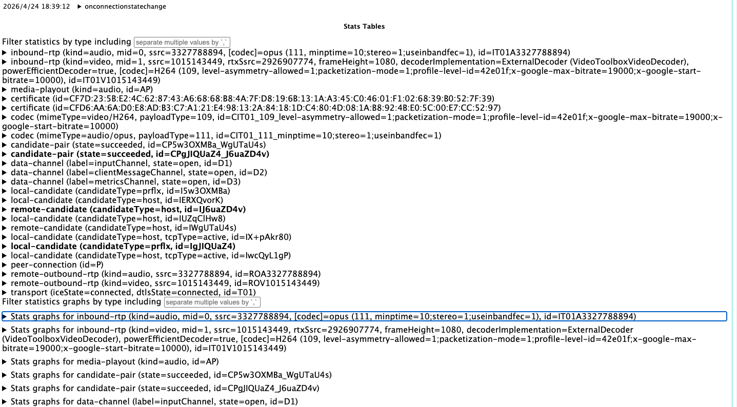 audioLevel は、ブラウザ側に転送されてきた音量を示すグラフです。これを見ることで、ブラウザに音声データが届いているのかどうかが判別できます。