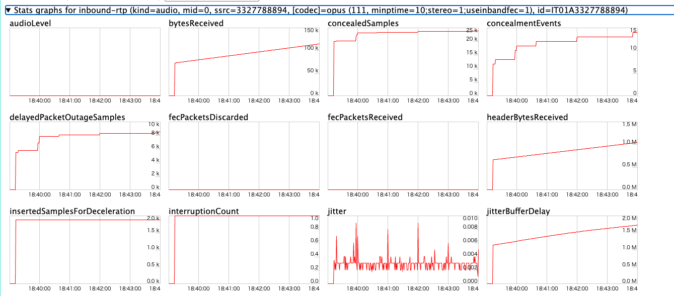 chrome://webrtc-internals/を入力する - 表示された画面から 「Stats graphs for inbound-rtp (kind=audio, ...)」 で始まる行を探して開く