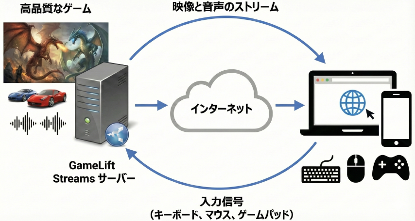 仕組みとしては、ゲーム自体の処理(実行)をすべてサーバー側で行い、その映像と音声を動画ストリームとしてクライアント(プレイヤー)のブラウザに配信します。プレイヤーはブラウザ上で映像を見ながら、キーボード、マウス、ゲームパッドを使って操作を行い、その入力がサーバーに送られる形になります。