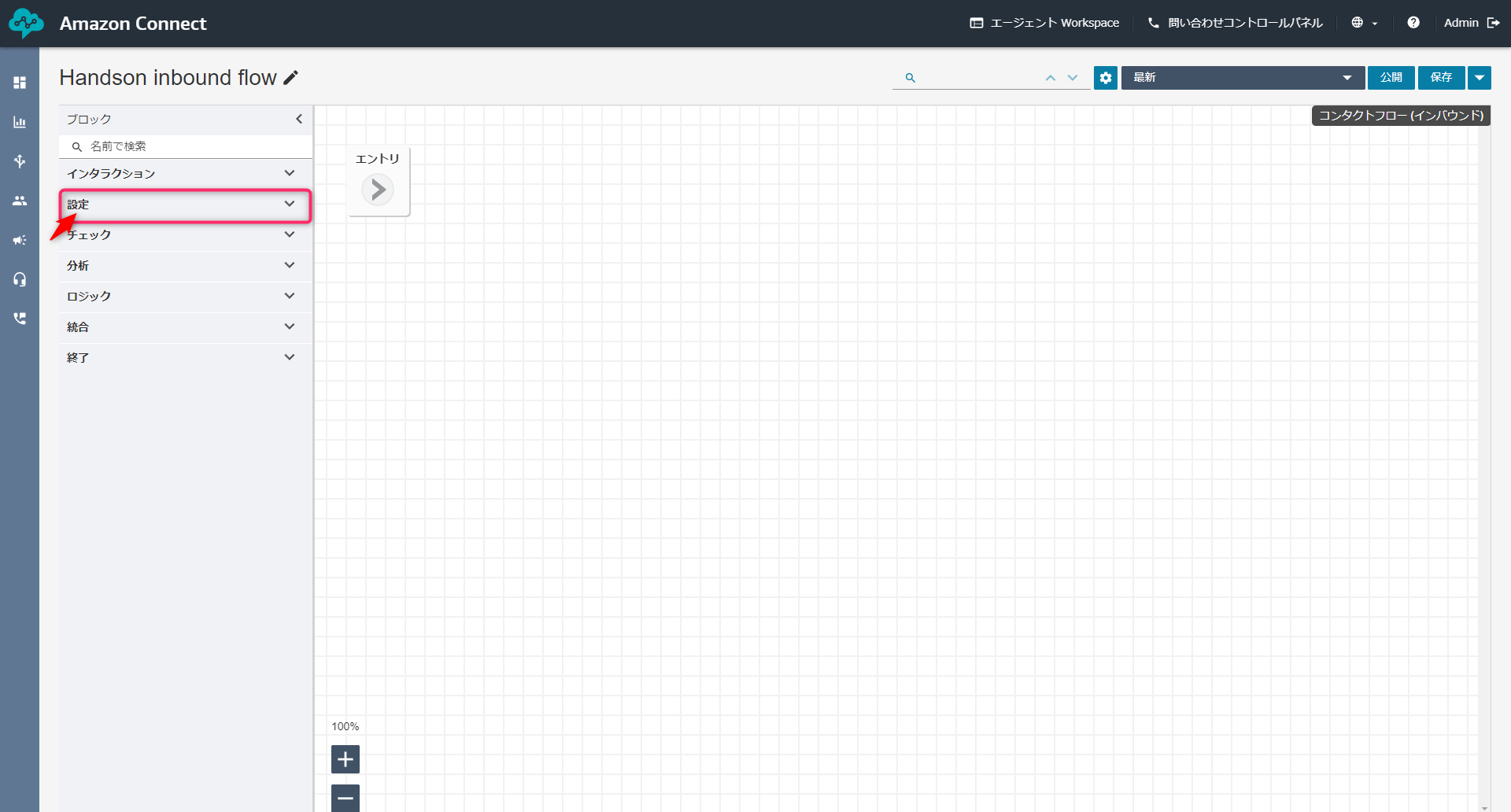 Handson inbound flow を開き、作業ブロックから「顧客キューフローの設定」をドラッグ & ドロップで配置します。