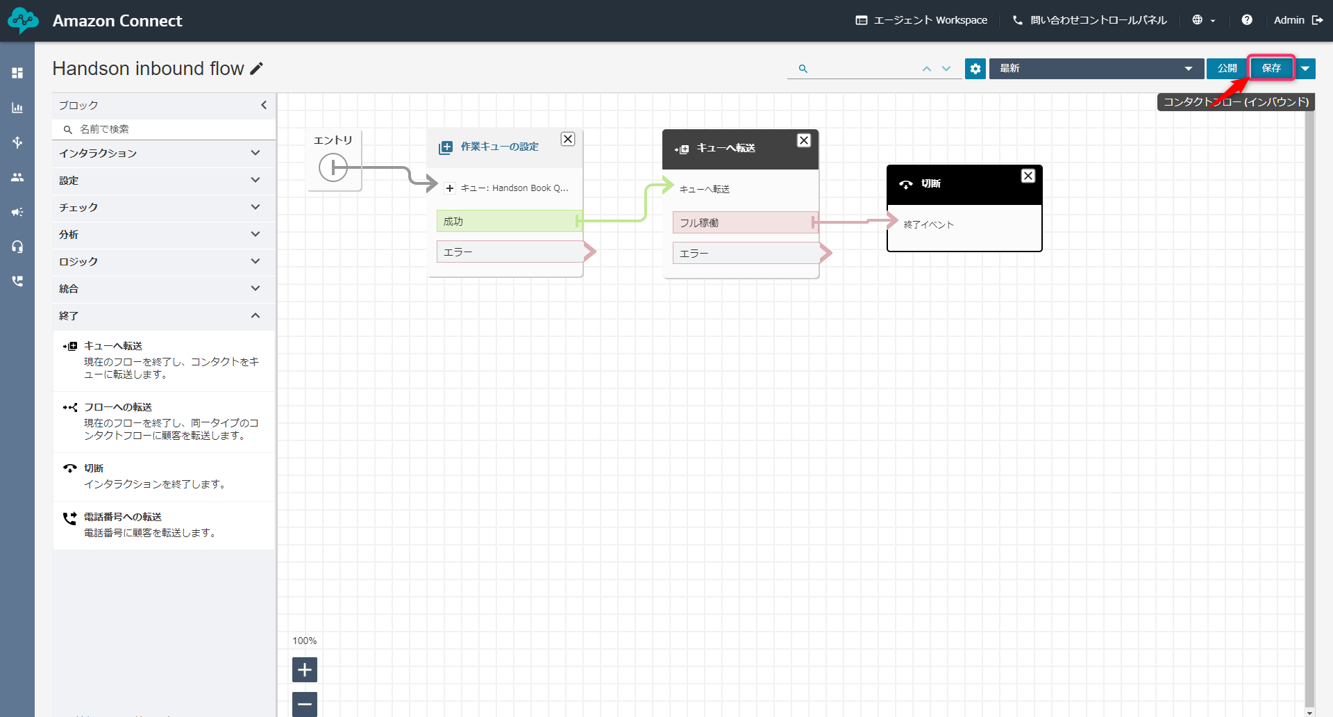 顧客キューフローの設定をクリックし、フローの選択で「Handson customer queue」を指定して「保存」をクリックします。