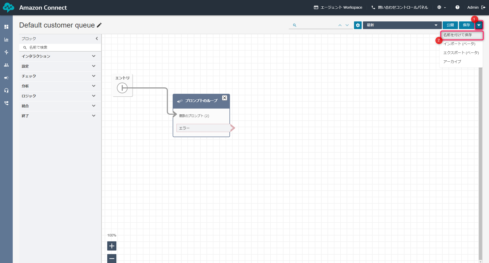 プロンプトのループをクリックして、デフォルトで設定されている英文を日本語で上書きして「保存」をクリックします。