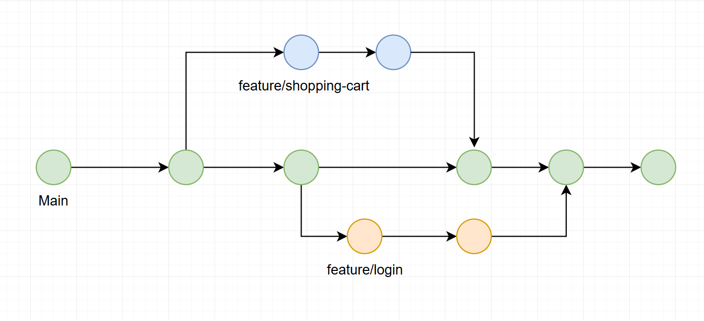 - ส่วน Branch อื่นๆก็แตกออกมาทำงานได้จาก branch หลัก ซึ่งบางบริษัทจะแตก branch ตามโปรแกรมเมอร์ที่รับผิดชอบ, บางที่ก็แตกตาม feature, hotfix, etc. ตัวอย่าง