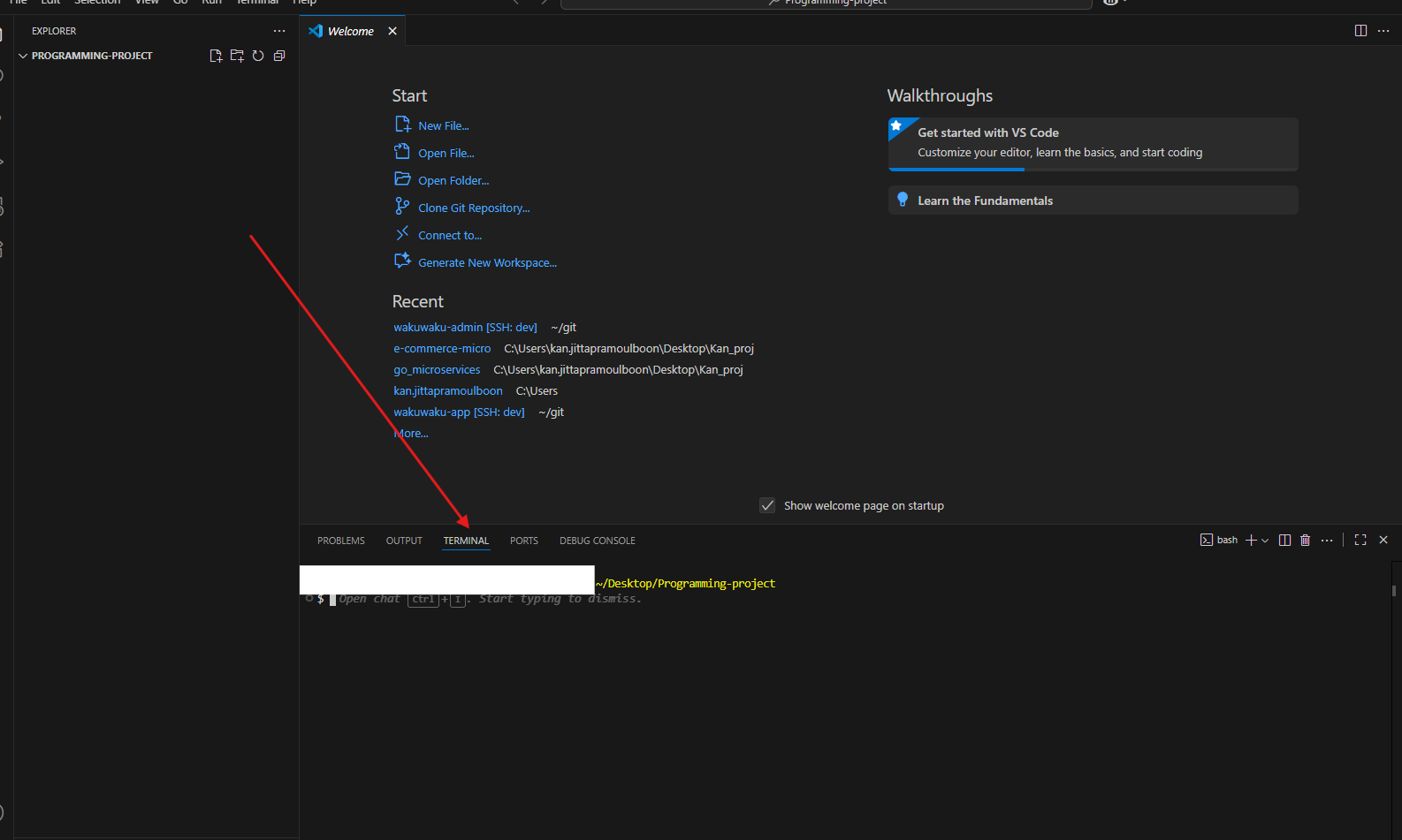 จะเห็นว่าข้างล่างมี Terminal (Bash) โดย path จะเป็นตามโฟลเดอร์ที่เปิดขึ้นมา (ถ้า Terminal ไม่แสดง ให้กด Ctl + J ที่คีย์บอร์ดเพื่อแสดง terminal)