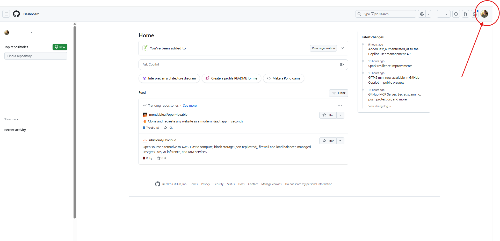 - พอสมัคร GitHub เรียบร้อยจะได้ GitHub หน้าตาประมาณนี้ครับ ให้คลิกที่รูปโปรไฟล์ขวาบนครับ