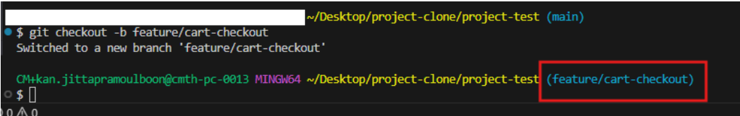 ในภาพตัวอย่างนี้ ผมใช้คำสั่งเพื่อสร้าง branch ใหม่ชื่อ feature/cart-checkout แล้วย้ายไป branch ดังกล่าว
