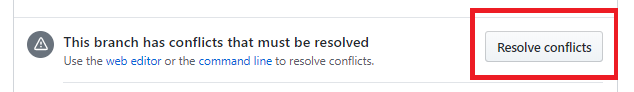 โดยเราสามารถคลิกไปที่ "Resolve conflicts" เพื่อแก้ Conflict โดยตรงตรงเลยก็ได้ครับ แต่ผมรู้สึกว่าใช้วิธีแก้ Conflict ใน Git Local ของเราจะสะดวกกว่า เพราะ IDE อย่าง VsCode จะมีเครื่องมือช่วยแก้ Conflict ที่ง่ายกว่า