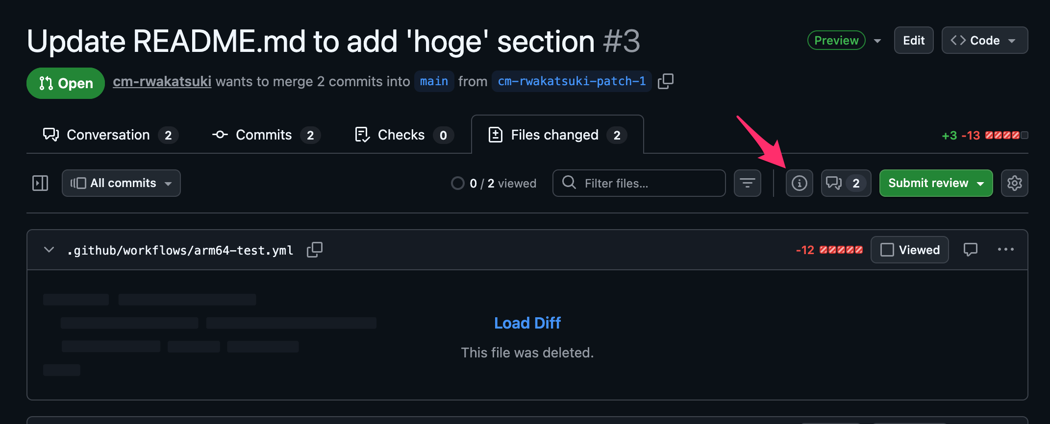 同じく Files changed タブ内上部に i メニューが追加されています。クリックします。