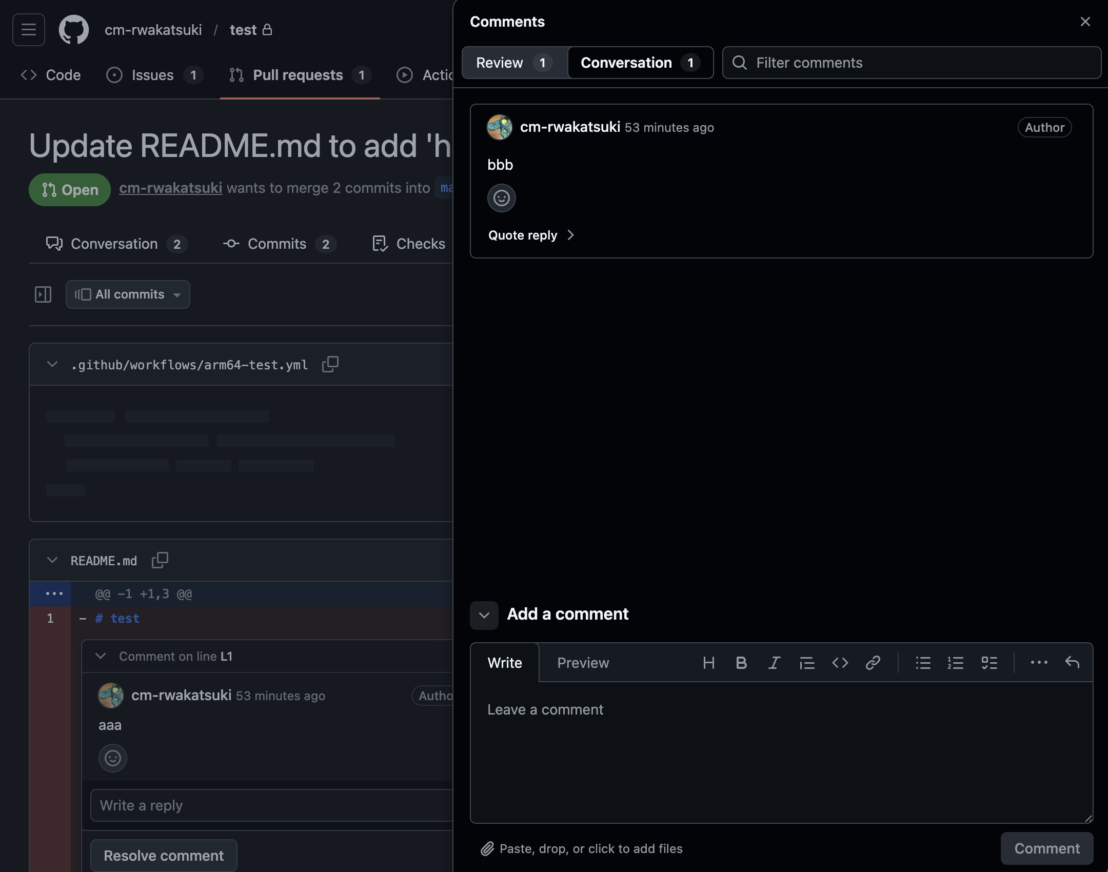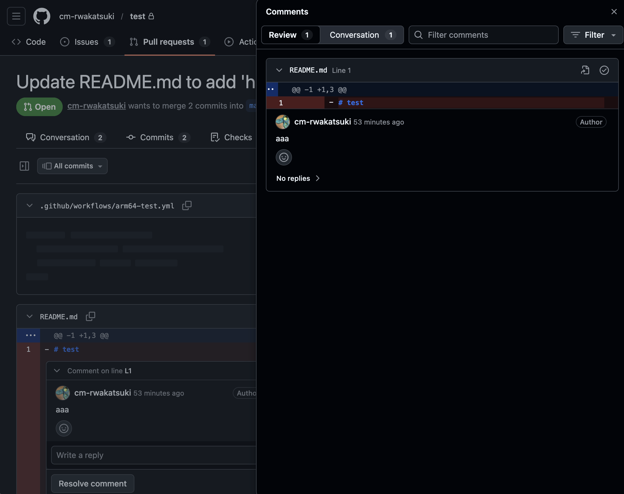 - プルリクエストの説明やコメントをタブを切り替えずに表示
