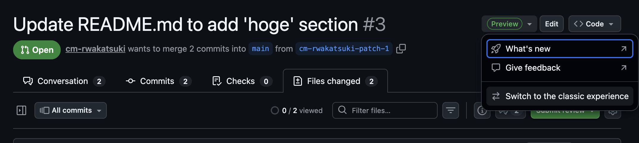 以前の UI に戻りました。今回追加されたメニューの代わりに Ask Copilot や Review in codespace などのメニューが消えていたんですね。逆にこれらを多用している人は以前の UI のままの方が良いかもしれません。