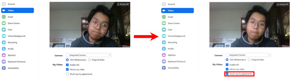 และอีก1ปัญหาที่จะไม่พูดถึงไม่ได้เลยก็คือ หน้าตาของเรานี่สิ อยู่บ้านทั้งที จะแต่งหน้าจัดเต็มก็กระไรอยู่ ซึ่งใน Zoom เองนั้น ก็มีคำสั่งที่จะช่วยในการทำหน้าท่านดูเรียบเนียนพร้อมประชุม ซึ่งสามารถไปตั้งค่าได้ที่ Video ที่หัวข้อMy Video ให้เราคลิ๊กเครื่องหมายถูกที่คำสั่งTouch up my appearance