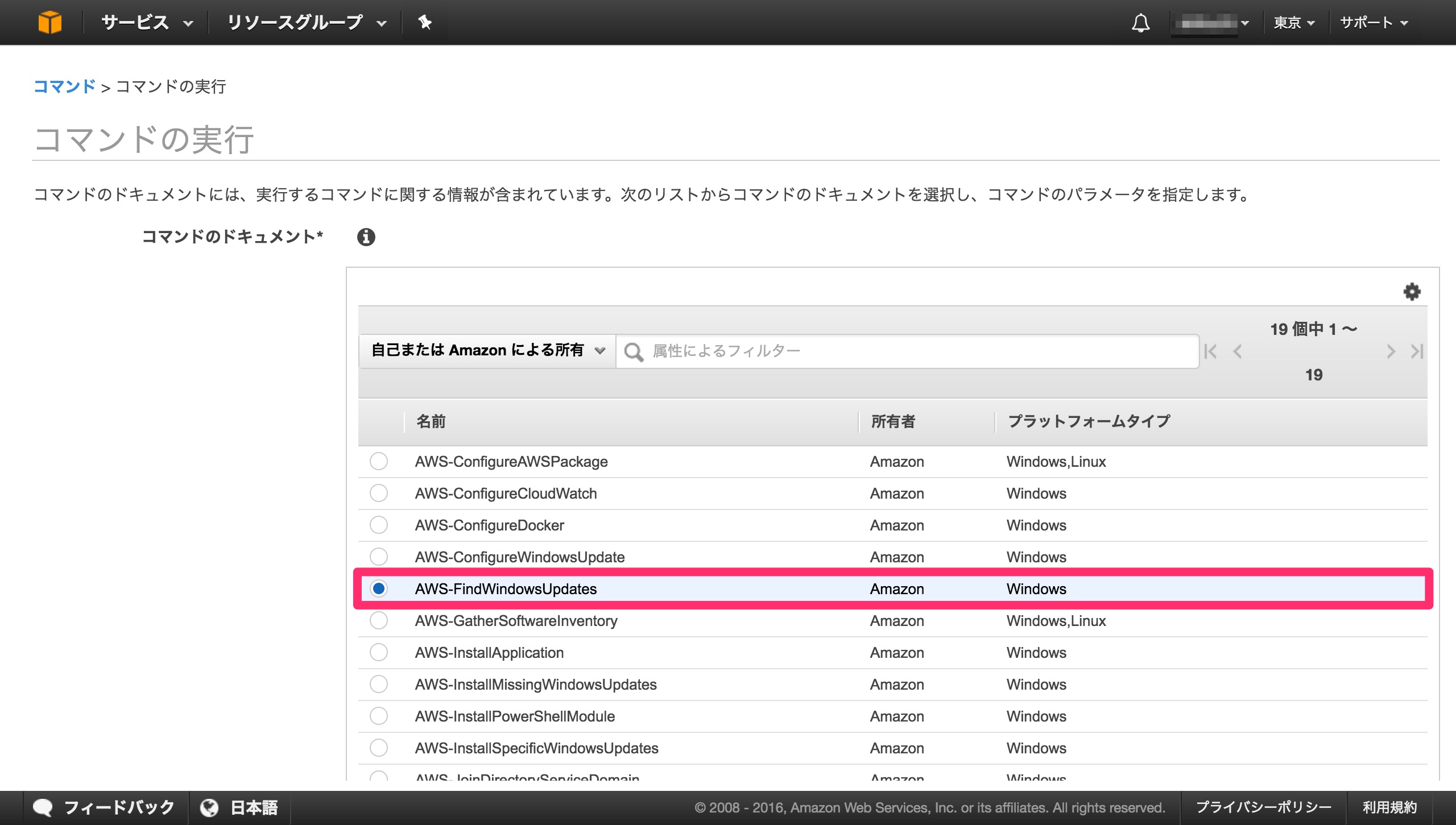 まずは、適用可能なWIndows Updatesを確認するため、AWS-FindWindowsUpdatesを実行します。