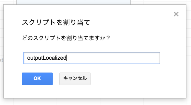出てきたダイアログにoutputLocalized関数を指定すると、テキストにスクリプトが割り当てられます。