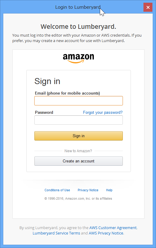 Lumberyard を利用するには、Amazon.com アカウントが必要です。AWS でも Amazon.co.jp でもなく Amazon.com です。アカウントを持っていない場合は作成しておきましょう。