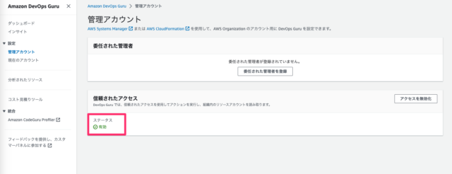この操作で Amazon DevOps Guru の管理アカウント設定画面でも信頼されたアクセスが有効になります。