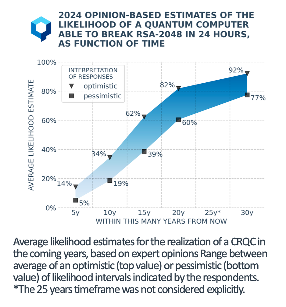 The GLobal Risk Instituteの2024年のレポート "Quantum Threat Timeline Report 2024" によると、約半数の専門家が15年後(つまり2040年頃)にはCRQCが登場すると予測しています。