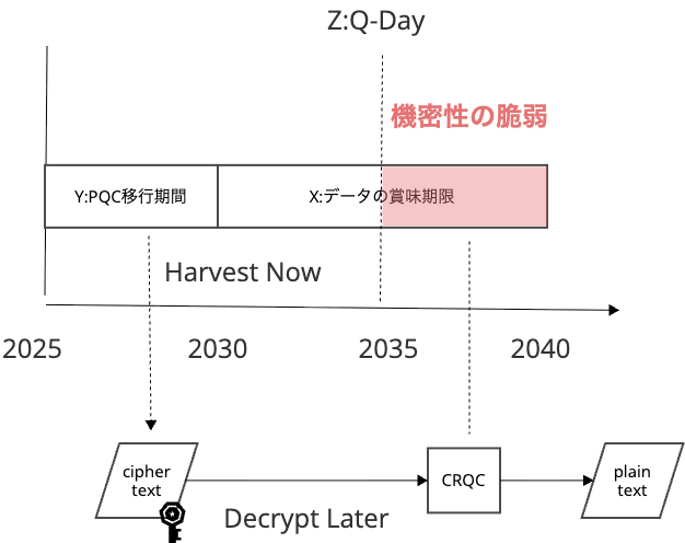HNDL攻撃は、PQCのワードとともに登場する機会の多い最も重要なキーワードの1つです。「今(Now)」古典暗号で暗号化されているデータを収集(harvest=収穫)しておき、「未来(Later)」Q-Day到来後に量子コンピュータ(CRQC)で解読するという攻撃手法です。