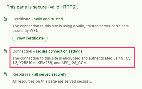 Chrome の場合は Developer Tools → Privacy and security → Connection で確認できます。「X25519MLKEM768」のような表示があれば、PQCハイブリッド鍵交換が使用されています。