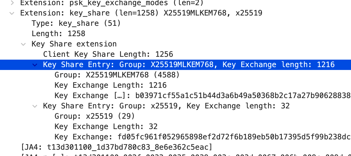 ハイブリッド鍵交換のX25519MLKEM768では公開鍵が1216バイトとなり、MTU(1500バイト)の閾値に近づきます。