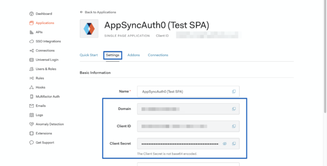 Settingsタブを選択し、Domain、Client ID、Client Secretをメモしておきます。