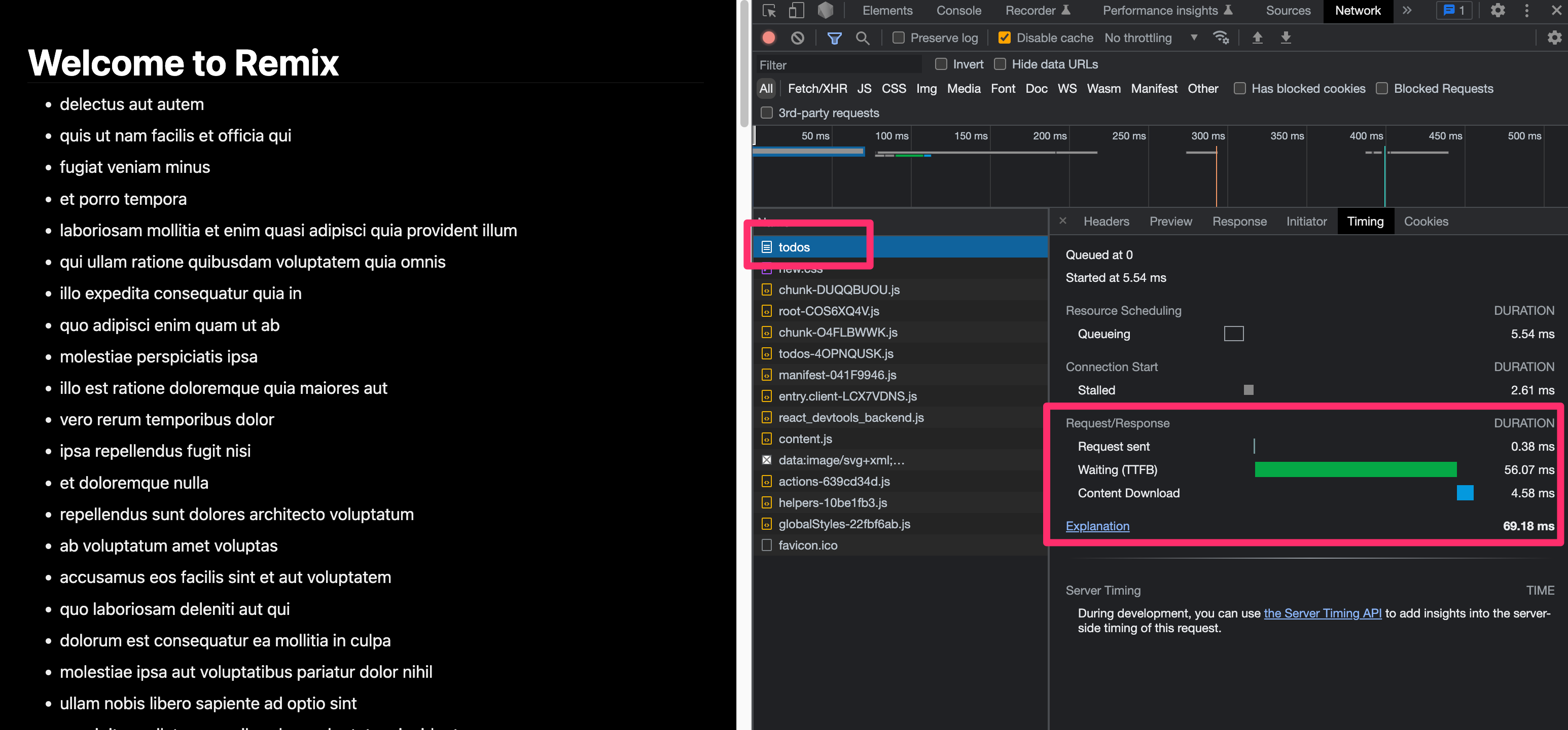 RemixはSSR時にAPIからデータ受信を行うため今回はブラウザに最初のデータが到達する時間、TTFBを参考にしてみます。早速http://localhost:8787へアクセスしてページのTTFBを確認してみましょう。