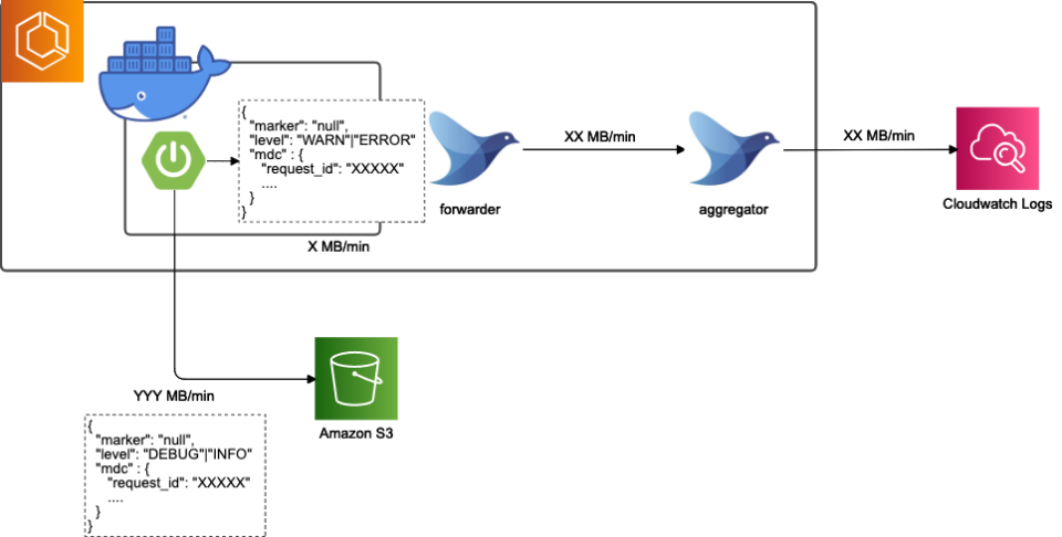 アプリケーションログ(INFO|DEBUG以降)は標準出力に出さず、ファイルに出力。アプリケーション自身がローテーションのタイミングで S3 に直接アップロードを実行します。これにより、標準出力のログが大幅に抑制することができそうです。