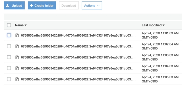 コンテナIDがめちゃくちゃ長いので見切れてますが、1分ごとにログがアーカイブされてアップロードされています。
