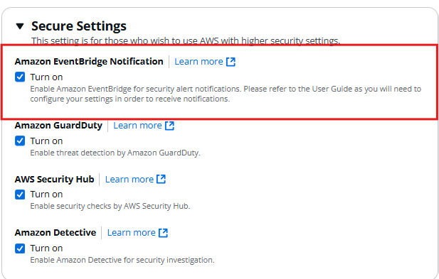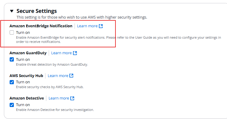 - ที่หัวข้อ "Secure Settings" ให้ติ๊กเปิดการใช้งาน "Amazon EventBridge Notification" อีกครั้ง