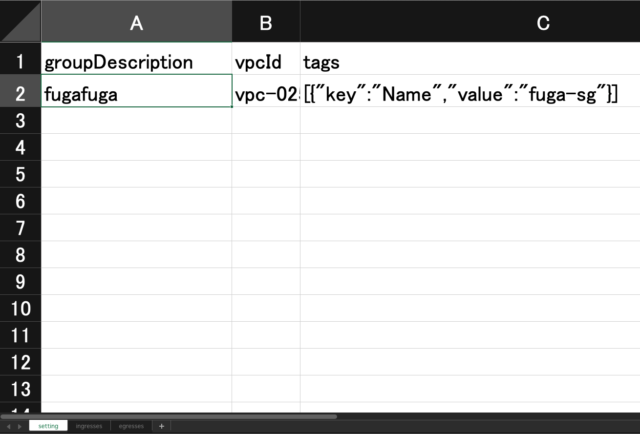Excelファイル内には、インバウンド(ingresses)、アウトバウンド(egresses)、セキュリティグループの名前やタグなどの情報(setting)としてそれぞれでシートを分けるもとのとしました。
