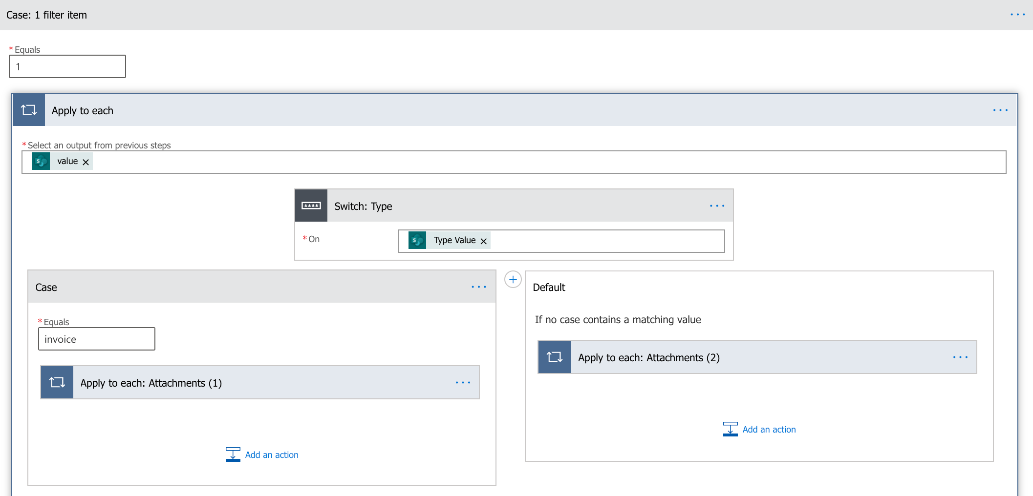 - フィルターしたアイテムのタイプがAの場合は、処理1(OneDriveのフォルダaへ添付ファイルを保存)、タイプBの場合は処理2、該当アイテムがなければ何もせず終了。