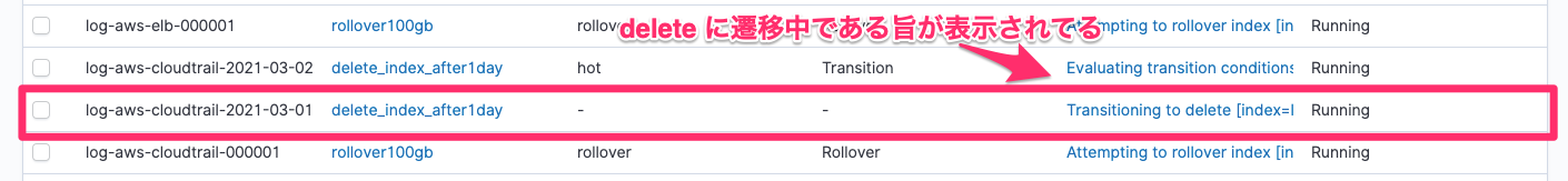 1日後(24時間後)にインデックスを確認したところ、ポリシーで定義した通りに delete の状態に遷移し、最終的にインデックスがなくなった事が確認できました。