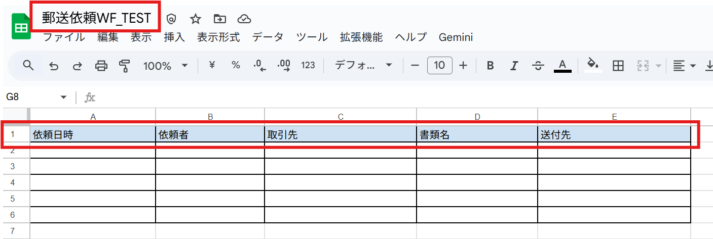 新しいスプレッドシートに分かりやすい名前をつけてから、記録したい項目を1行目に入力します。