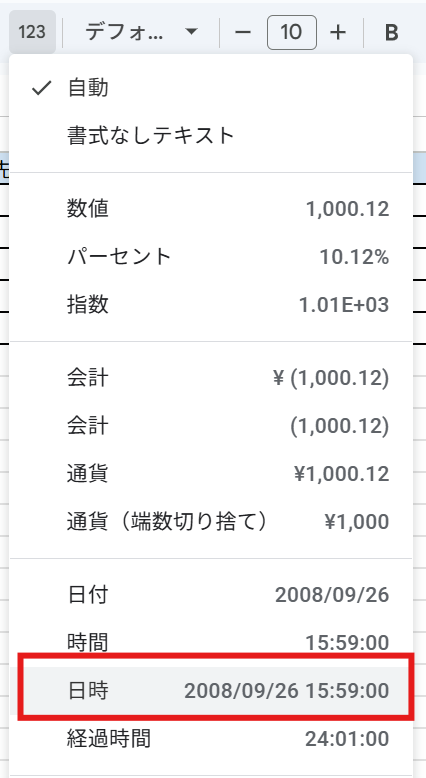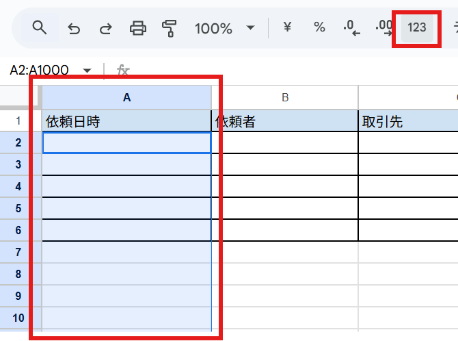 日時を記録したい場合、その列を選択して「表示形式の詳細設定」を開きます。(ツールバーの「123」です)