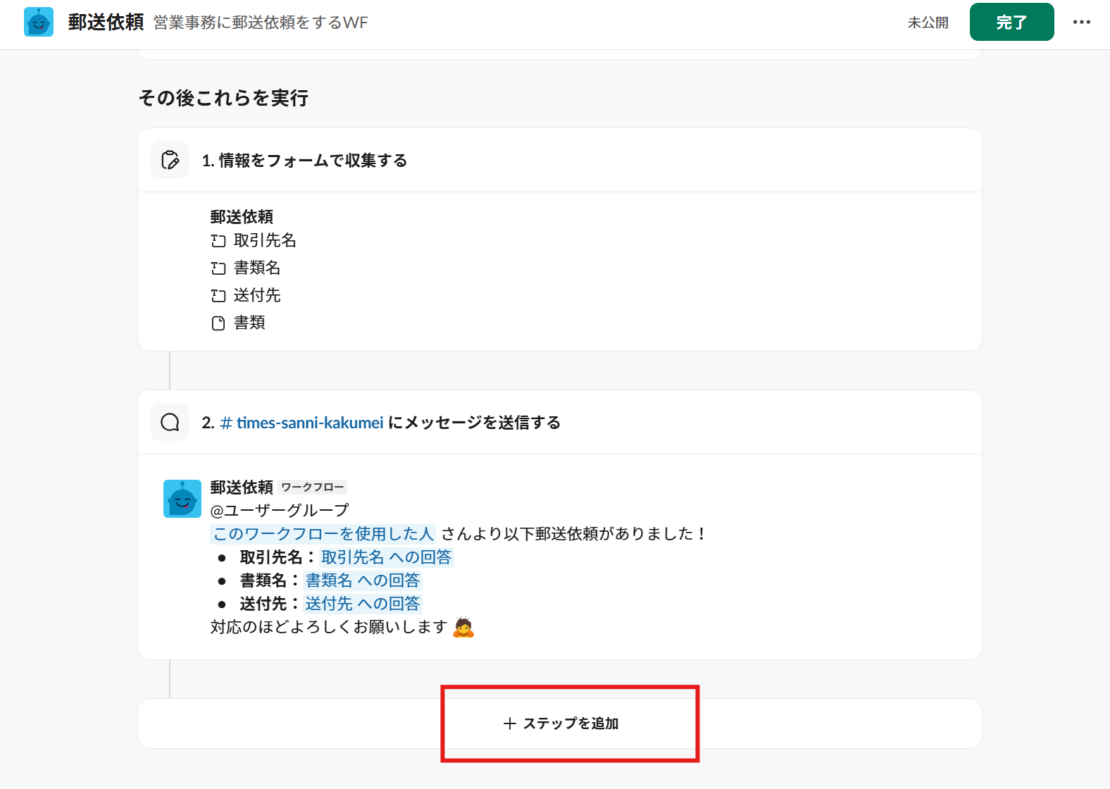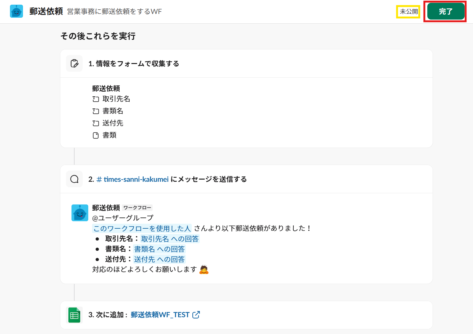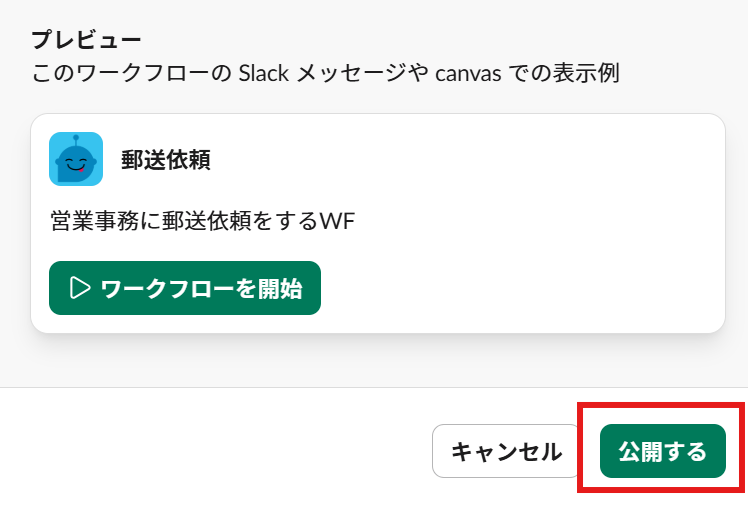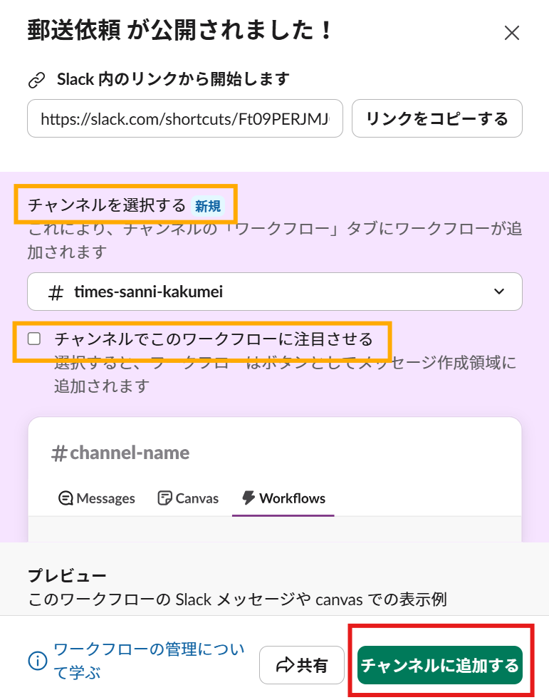 ワークフローが公開されて、ぜひ使用したいチャンネルに追加しましょう!