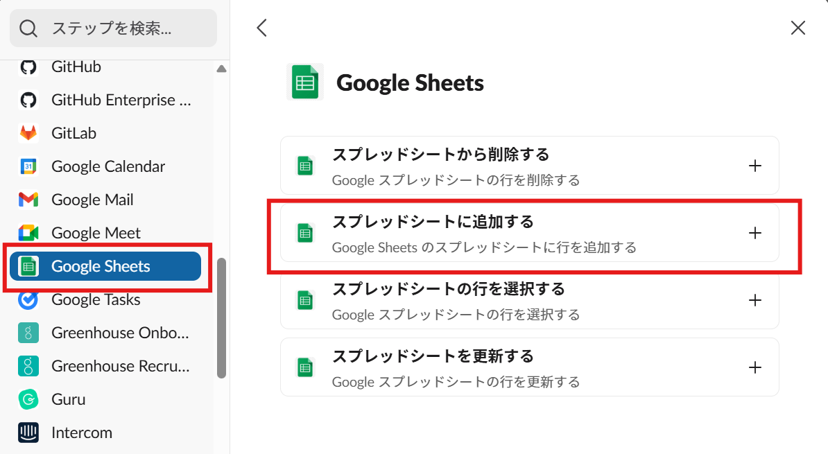 左側のメニューから「Google Sheet」を探してクリックし、右側に出てきた様々なステップの中から「スプレッドシートに追加する」をクリックします。