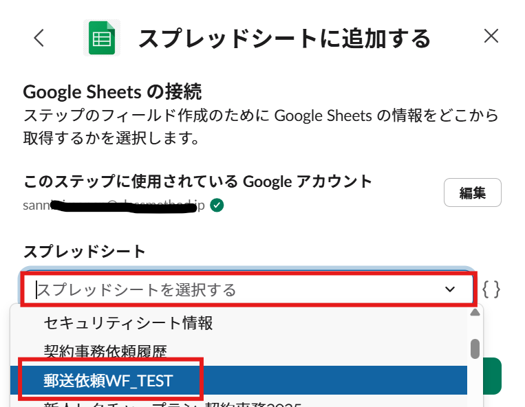 POINT:現在ワークフローではマイドライブに入ってるスプレッドシートしか拾えないので、必ずマイドライブに作りましょう