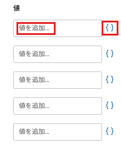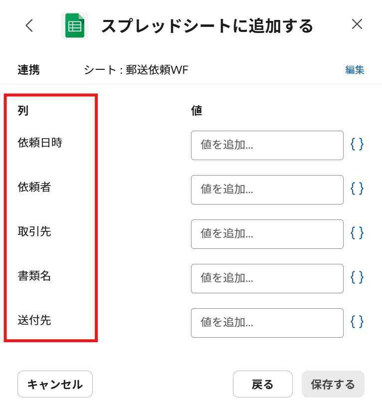 その列(項目)に対して値があります。こちらはスプレッドシートに1行ずつ転記したい情報を入力します。