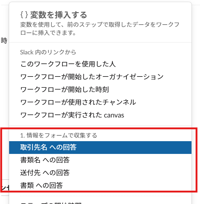 変数リストで「情報をフォームで収集する」ステップからそれぞれ質問への回答は選択できます。