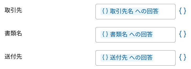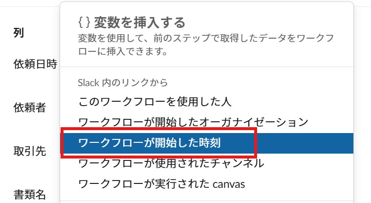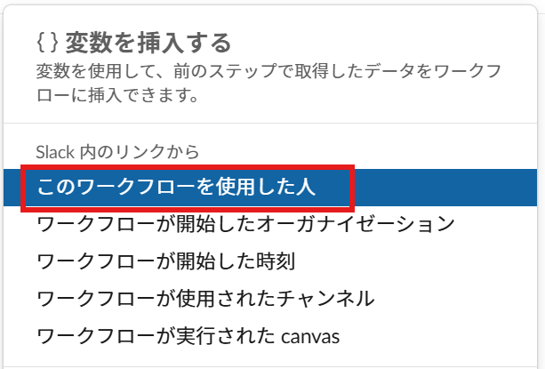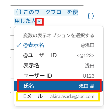 そのまま固定テキストでもいいですが、ワークフローの情報なら横のブラケットから変数を選びましょう!