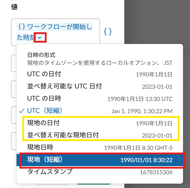 詳細設定からワークフローに合わせて日付・時間・日時のいずれかを選択します。