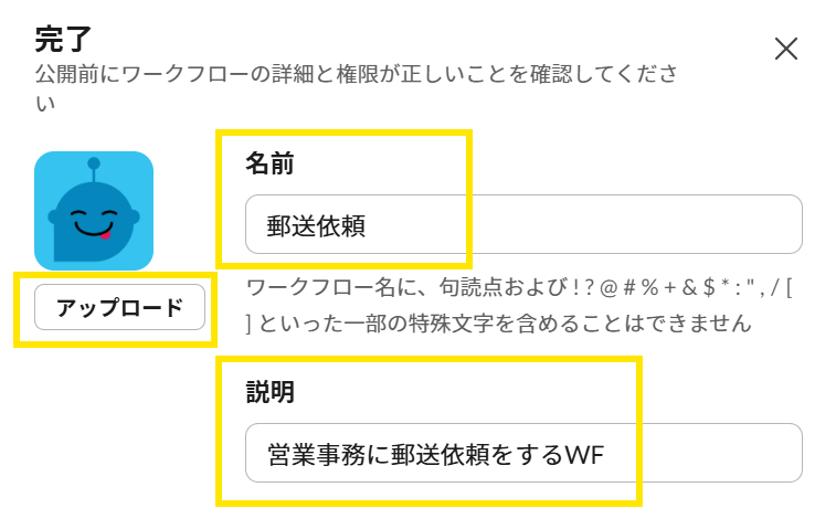 ここでワークフローの名前・説明・アイコンはまだ変更できます。