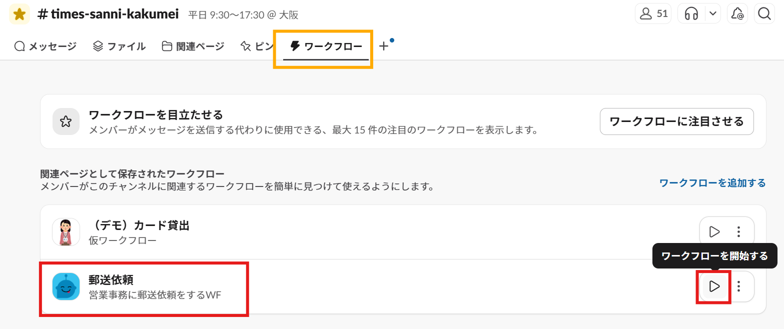 「チャンネルでこのワークフローに注目させる」をチェックすると、そのチャンネルでのメッセージ欄の代わりにワークフローが簡易に開始できます。