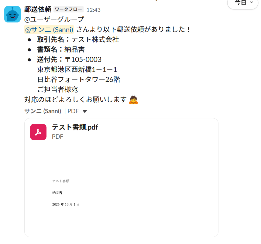 チャンネルのメッセージは12:43なのにスプレッドシートの時間は12:38になっていますが、スプレッドシートはワークフローを開始した時刻に設定しているため開始ボタンをクリックした時点が記録され、フォームの送信やメッセージの送信時間と異なります。
