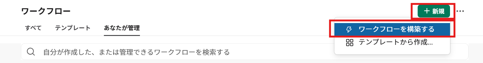 ワークフローのタブが開いたら、右上の「新規」ボタンをクリックし、ドロップダウンから「ワークフローを構築する」を選択します。
