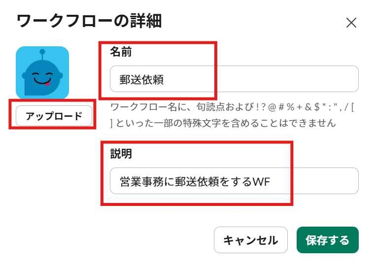 ワークフローの名前や説明を入力し、アイコンもアップロードしましょう!