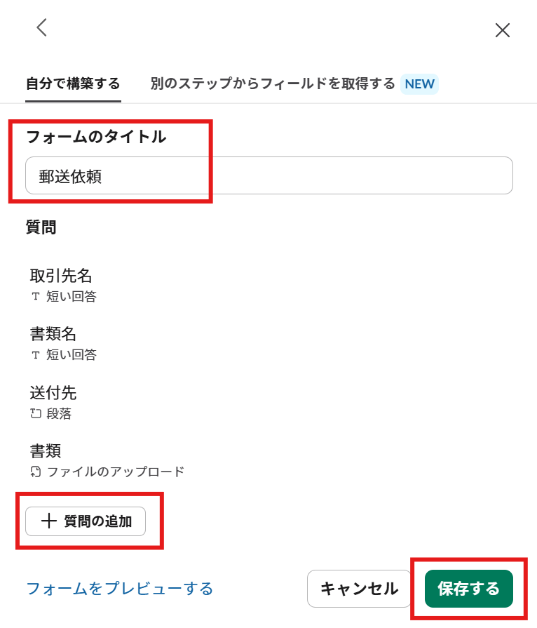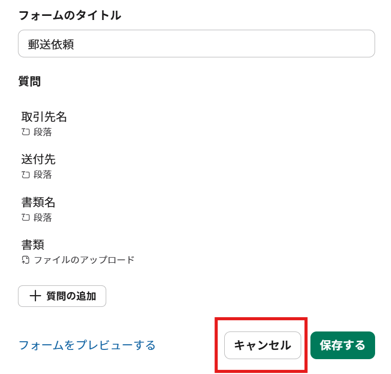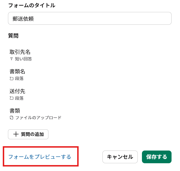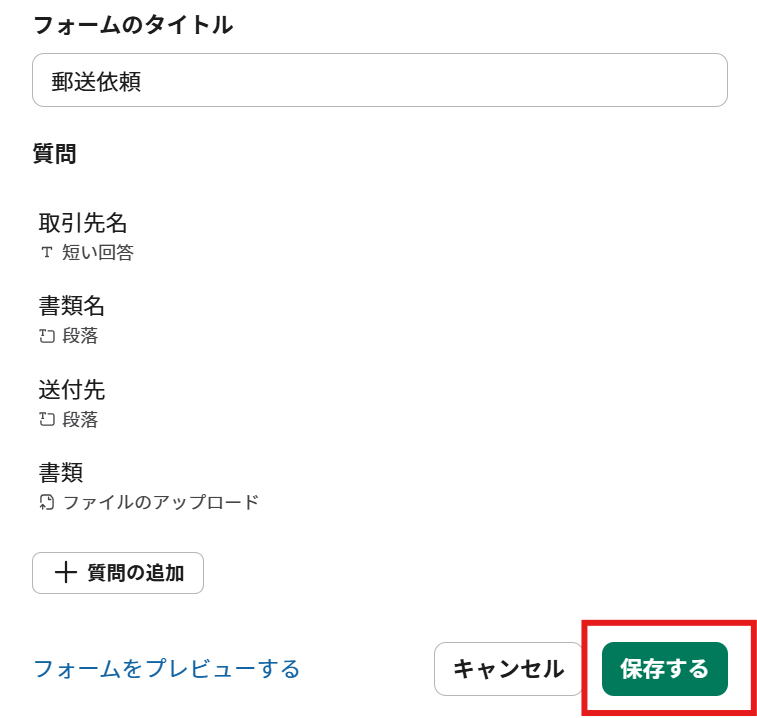 フォームのタイトルを入力し、「質問の追加」ボタンから質問を作成します。(質問の種類などは、のちほど紹介します) すべての質問が追加されたら、「保存する」ボタンをクリックして保存します。