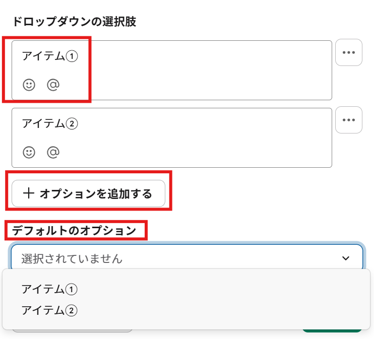 選択肢は「オプションを追加する」ボタンから複数設定できます。ドロップダウンと似ていますが、メンションや絵文字は使えません。